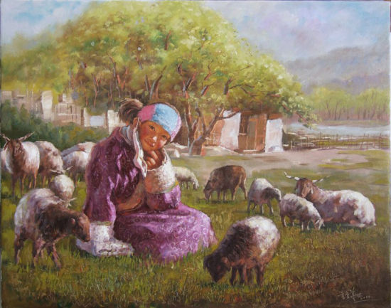 一個民族的生產生活方式會對新一代人的心理素質的形成產生深遠的影響;而民族心理素質的差異,就在于一代代人內心情感的差異。作品中寫到:“我摟住蜜糖的脖子,讓她把頭枕在我的肚子上,/感受著她呼吸的一起一伏,/我倆漸漸進入夢鄉。”這既表達出游牧民族的生活習性,更展現著一個牧羊少女特有的情懷。