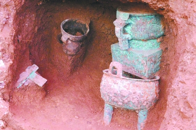 通過發(fā)掘,考古專家發(fā)現(xiàn)了目前石鼓山西周墓地中最大的一座墓葬。該墓葬呈長方形,深8米、寬約4米,為豎穴土壙墓,口小底大,約16.26平方米,棺室周圍有熟土或生土二層臺。屬于單人葬,頭向朝著地勢較高的方向,有東向、南向及西北向。葬具均為木質(zhì),隨葬品一般置于頭部附近的二層臺或壁龕內(nèi)。