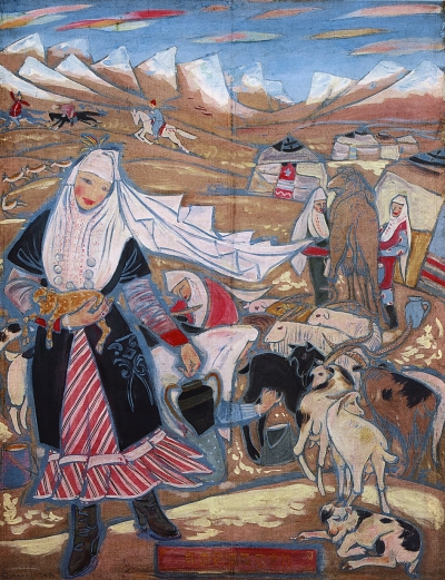 沒有明確的記載表明,董希文在1948年創作《哈薩克牧羊女》時曾去過西北。但之前的西北生活讓他積累了豐富的民族素材。在這件作品中,畫面的女主人公——哈薩克牧羊女——右手懷抱著一只棕色的初生羔羊,左手提著陶制的赭石色奶罐。她的身體略微右傾,而頭向左擺,整個人呈現出弧線形。在她的臉上,露出了少數民族特有的真誠的笑容。風吹過,掀起了她潔白的頭巾和鮮艷的裙擺,她仿佛笑得更甜了。她的身旁遍布著羊群,身后還有牧羊女在擠羊奶和駱駝奶。遠處氈房羅列,騎馬的牧民在小山坡上追逐嬉戲。雪山則傲立于畫面更遠的深處,天上還飄浮著五彩的云朵。這種猶如世外桃源一般的祥和的畫面,不禁使人心曠神怡,仿佛給當時混亂的時局吹來了一陣和諧安定的清風。