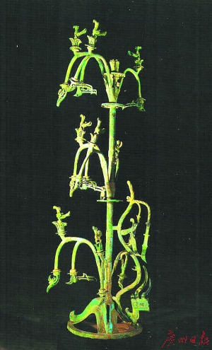 《山海經》中記載說:“湯谷上有扶桑,十日所浴,在黑齒北,居水中,有大木,九日居下枝,一日居上枝?!比嵌殉鐾恋倪@棵青銅神樹正是這一傳說的真買寫照。