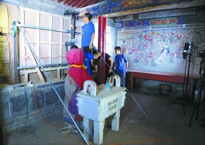 在延慶張山營西五里營村龍王廟,工人正對壁畫進行切割揭取。周寶平攝