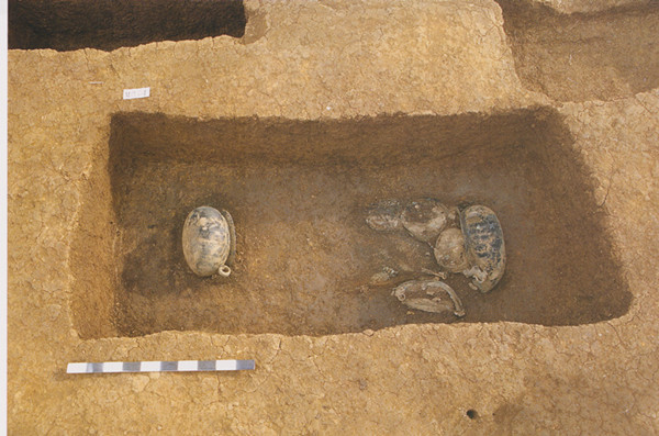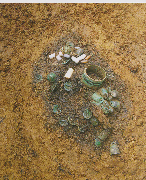 第二天一早,興奮了一夜的隊員們再次來到出土這些奇形怪狀器物的祖家老包小土丘上,在朝陽的映襯下,那黃色的土地顯得異常的親切,仿佛它們已等了兩千年,今天終于等來了破解這塊黃土地下掩埋著的神奇密碼的考古隊。在祖家老包附近不同的土丘上,隨著犁鏵的條條犁痕,一座座土坑墓的墓邊和里面夾雜著大量紅燒土顆粒的墓葬填土異常醒目,不用說,這是一處與此前發掘的漢墓不同的青銅時代墓地。考古隊也不急著收隊回貴陽了,將正在發掘的漢墓清理完后,迅即轉戰祖家老包,當年即清理了25座夜郎時期不同于漢墓的地方土著民族墓葬,發現了非常奇特的“套頭葬”和一批獨具地域特色的青銅器,包括容器、兵器和裝飾器等,真正揭開了貴州夜郎考古的序幕。