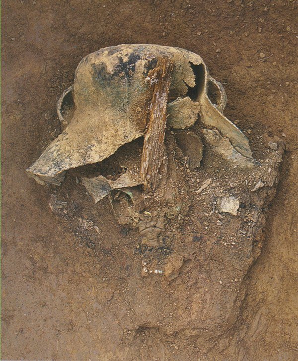 張合榮:應該是“套頭葬”這一特殊葬俗吧,“套頭葬”最早是在赫章可樂的墓中發現的,后來考古工作者把1976-1978年的發掘資料整理成《赫章可樂發掘報告》,編寫者認為在清理的168座乙類墓中,有20座墓葬的葬式較為特殊,墓底一端側放一釜(銅、鐵釜均有)或一銅鼓,頭骨置于其中,軀體則放墓底中部。其中M58葬式尤為罕見,在墓底一端側放一銅釜,內放人頭骨;腳端側放一鐵釜,內有腳趾骨。他們把這種將死者頭部用大型銅器罩住的特殊葬俗稱之為“套頭葬”,其實,時至今日,這種奇特的葬俗在國內還僅見于赫章可樂,因而“套頭葬”也成為可樂墓地的標志性文化特征。