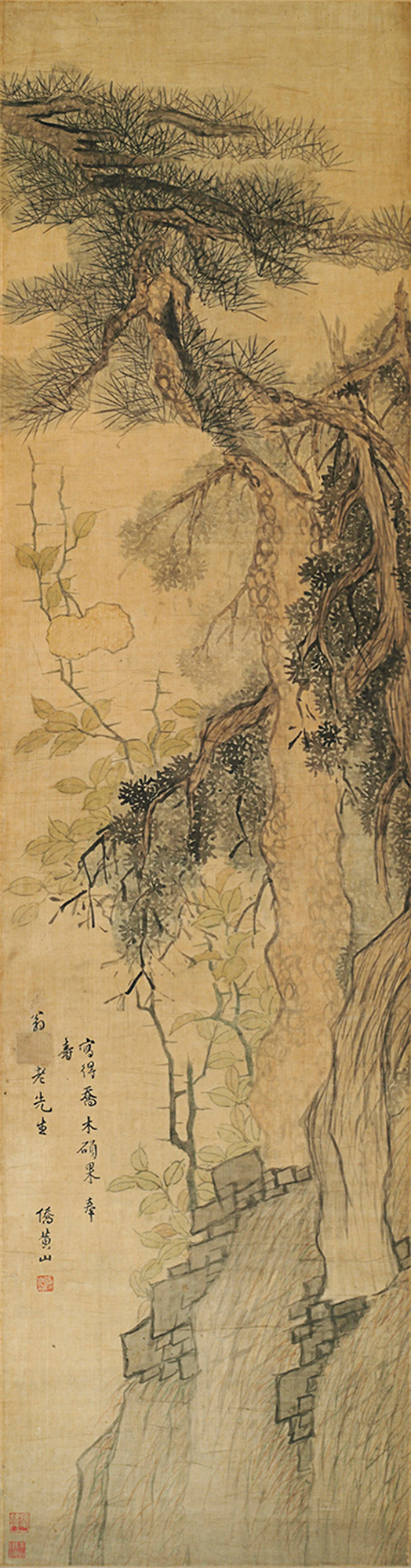 傅山最初如何習畫,師承何人,今已不得其詳。但傅山對書畫方面的天賦和造詣早年就顯現出來,在他二十六歲時曾被收藏家黃雙鳳請為所藏宋元書畫鑒賞。另載傅山曾與回族畫家梁檀相交篤甚,時常前往請教,并撰有傳記。從現存梁檀書畫看,傅山與其有一定的淵源關系。傅山繪畫作品現存不多,皆以山水、松石、花卉、禽鳥等見長,屬文人逸格一派,且風格多樣,博采眾長,或取徑院體,或法元人寫意,或賦彩整密,或醉墨淋漓……,不落古人窠臼,主在性情及認知的表達,以氣骨勝,《畫征錄》載有:“傅青主畫山水,皴擦不多,丘壑磊珂,以骨勝,墨竹也有氣”。從傅山《題自畫老柏》詩可知揮毫潑墨概發于意者:“老心無所住,丹青莽蕭瑟……擲筆蕩空胸,怒者不可見。笑觀身外物,消遣又幾日。”
