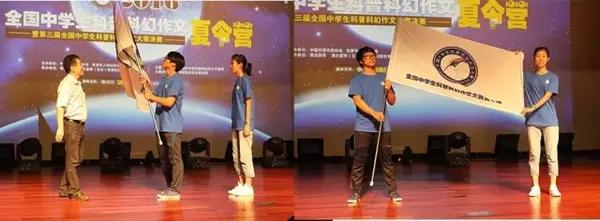 在熱烈的掌聲中,世界華人科幻協會會長,吳巖先生上臺授旗,標志著本次夏令營正式開始。他將科普科幻大賽夏令營的營旗傳遞給營員代表將開幕式推向了高潮。