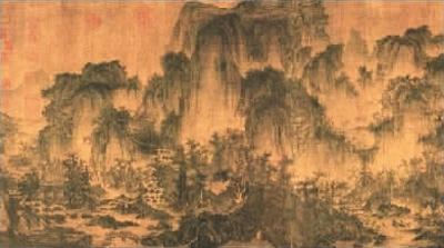 李成乃唐宗室后裔,祖籍長(zhǎng)安(今西安),后周時(shí)避居于營(yíng)丘(今山東臨淄),故其又被稱為“李營(yíng)丘”。李成長(zhǎng)期居于北方,此圖描繪的正是北方夏日山水之景,近處輕舟泊渡,行人車馬往來(lái),山谷之間殿閣林立,塔影隱沒(méi)其中。遠(yuǎn)處奇峰崛立,氣象雄渾。北方山石質(zhì)地堅(jiān)硬,裸露少土,多棱角凹凸,此畫中作者以形似斧劈和卷云的皴法,呈現(xiàn)出了北方典型的地貌特征。