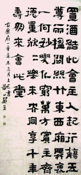 鄭簠素來(lái)作書(shū)精勤,態(tài)度認(rèn)真,其弟子張?jiān)谛劣凇峨`法瑣言》中言:“先生作字正襟危坐,肅然以恭,執(zhí)筆在手,不敢輕下,下筆遲遲,敬慎為之。”而這幅藏于上海劉海粟美術(shù)館的鄭簠書(shū)法軸內(nèi)容為晉傅玄所作《前有一樽酒行》,原詩(shī)為:“置酒結(jié)此會(huì),主人起行觴。玉樽兩楹間,絲理東西廂。舞袖一何妙,變化窮萬(wàn)方。賓主齊德量,欣欣樂(lè)未央。同享千年壽,朋來(lái)會(huì)此堂。”而詩(shī)中“絲理”被鄭書(shū)為“絲竹”,不知是版本之訛還是筆誤,俟考。然此并無(wú)礙這件作品的妙處,其妙處有三:一是作品中體現(xiàn)出的新理異態(tài)。于鄭之前,隸書(shū)的用筆平直古板、結(jié)體整齊均勻,而這幅作品用筆有輕重的主次變化,融入草書(shū)的疏勁筆意。如“絲”“萬(wàn)”等筆畫(huà)的牽絲連帶以及尾筆飛白的舞動(dòng),皆有草意。二是作品章法上字距寬疏、行距緊密的布局規(guī)律,氣息面貌富有書(shū)卷氣息,此常被唐以后多數(shù)寫(xiě)隸書(shū)者所忽視,而這也是令他成為清代碑學(xué)運(yùn)動(dòng)先聲的原因之一。三是這件作品于“三月上巳”所書(shū),以此詩(shī)記,可想當(dāng)日他與友人流杯曲水飲宴之狀,頗有書(shū)外情境。