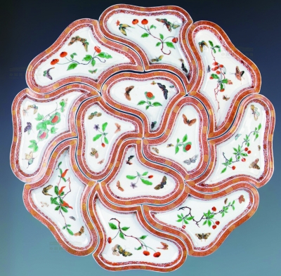 此攢盤作于清康熙年間,由內(nèi)外兩層共12件大小盤組成葵花式樣。盤折沿,淺腹,平底,圈足。盤內(nèi)五彩繪花卉蝴蝶紋,沿面紅彩描金,盤外壁紅彩八吉祥紋,并描金篆書“瘦”字。