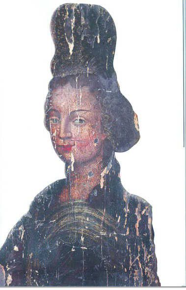 ●油畫木美人 兩幅在厚木板上的古代仕女圖像。畫面是兩個與真人一般大小的西洋美女,身高均160厘米,穿低領(lǐng)漢式襟衣。兩位“木美人”鵝蛋臉,鼻梁高挺,眼窩凹陷,立體感很強(qiáng),有明顯的西洋人特征。研究者認(rèn)為,此件“木美人”是我國最早的油畫作品,其藝術(shù)性不遜于意大利油畫家達(dá)·芬奇的《蒙娜麗莎》。