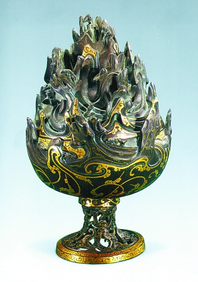 在富于動(dòng)勢(shì)的丘壑林泉之間,出沒(méi)著警覺(jué)的虎、猴、豬等野獸,以及伺機(jī)捕獲它們的獵人。類似的意象組合在漢代藝術(shù)中比比皆是。我們?nèi)狈ξ鳚h人對(duì)立體山巒設(shè)計(jì)動(dòng)機(jī)的直接記載,不過(guò)后世人普遍相信熏爐蓋上的山峰與蓬萊三島或昆侖山有關(guān)。在六朝以后的詩(shī)文里,人們習(xí)慣將山形的熏爐稱為“博山爐”。在一些“博山爐”中,涌動(dòng)在山腳下的確實(shí)很難辨別究竟是云氣還是波濤。良工巧匠將日常用具處理成充滿不確定因素的視覺(jué)形象,器物的擁有者顯然對(duì)此極為嘉許。
