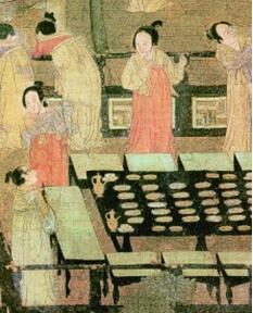 在飲食上,也很有講究。在七夕節前,婦人們便要以紅熬雞以及其他的時新果品,互相饋贈,取吉慶之意。負責果品進貢的蜜煎局還會在市場上售賣水蜜木瓜。孟元老的《東京夢華錄》中還記載售賣七夕物品的乞巧市的熱鬧場景,“自七月初一為始,車馬喧闐,七夕前兩三日,車馬再次壅遏,不復得出,至夜方散。”這歡愉熱鬧的節日氣氛不難讓人想見宋代市民城市生活的美好。