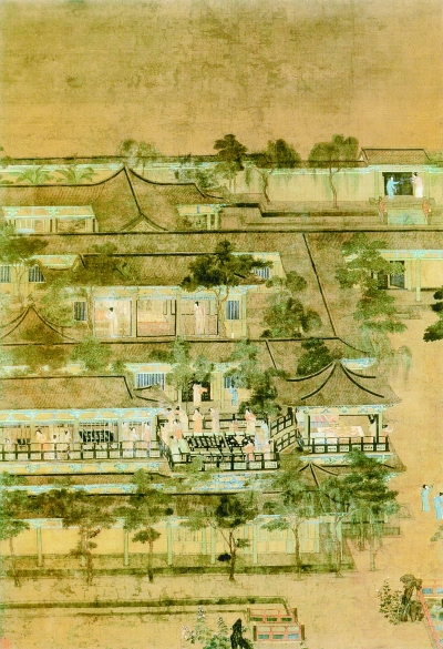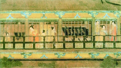 在這座樓閣疊起的王苑公館內,建以巷道分割的多進大小院落,木結構建筑的前廳、后廊,樹蔭掩映,四周環以回廊。中軸線左右側建有多座較小院落,明間裝門,左右間裝窗。正如畫面所示,當時的門主要是版門,窗一般為直欞窗和破格子欞窗。廊廡環繞,一方面通過門和道路組織最佳觀賞路線,另一方面又通過重重廊廡增加縱深感,形成建筑物內向的封閉式院落,既表現了豪貴生活的驕縱富有,又顯示了深宮仕女的凄清冷寂。