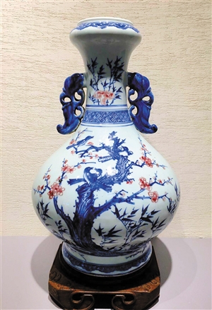 談到青花釉里紅的魅力,楊衛說,釉里紅是我國的傳統釉下彩裝飾之一,它是用銅作著色劑的色料在坯體上描繪各種紋樣,然后施透明釉經過高溫還原氣氛燒成,在釉里透出紅色的紋樣,所以稱“釉里紅”。因為燒成合格品很困難,所以產品極為名貴,釉里紅有單獨裝飾的,但大多數與青花相結合在一起進行裝飾而稱為“青花釉里紅”。“‘青花釉里紅’的特點既有青花的‘幽靚雅到致,沉靜安定’的特色,又增添了釉里紅的渾厚壯麗,豐富了色彩效果,形成了高雅而又樸實的藝術風格。因此,青花釉里紅瓷成為我國珍貴的品種之一。”楊衛說。