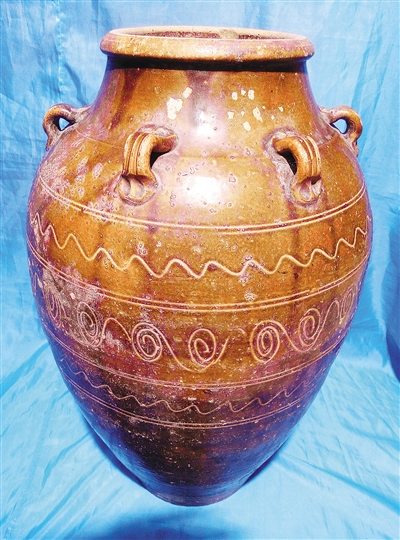 在容族新的家里,每件藏品的故事都獨一無二。“那件明代醬釉水波紋、螺紋六耳缸,我整整關注了兩年,直到今年春節,才成功收到手里?!闭f起這個極具反轉效果的故事,容族新頗有些得意。