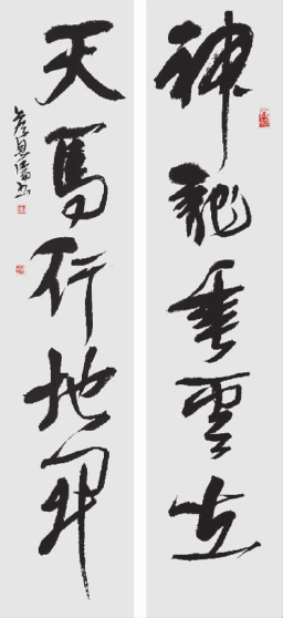 我望著他那一幅幅書寫著唐詩宋詞、諸子百家哲學、佛學等名篇名言的草書作品,大氣雄渾、豪邁曠達、勁健灑脫,縱橫天成,像大漠龍卷風,蘊含著狄奧尼索斯的酒神精神,一種壯士舞劍似的英雄氣概,一種奔放縱逸的塔里木河自由精神,給人振奮,讓人提神,給觀者一種酣暢淋漓的痛快。這里有筆墨,有神采,有大格局,是氣度軒昂的大漠書法,是渾厚雄壯的長安書法。他的草書形式上走王鐸、懷素等古人之路,而精神氣韻則出自自己的靈魂。他說: “我就是我!我要寫出自己的個性氣質! ”