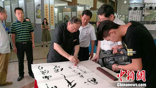 5日,“第七屆全國建材行業書畫展現場筆會”在北京舉行。會上,著名書法家崔承順、畫家王闊海等在現場進行創作。著名相聲表演藝術家姜昆亦出席了本次活動。參加本次筆會的知名畫家何寶立在接受中新網(微信公眾號:cns2012)記者采訪時表示,本次筆會在畫展中舉行的,形式新穎,“受到不少觀眾的歡迎”。