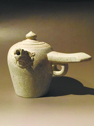 在鞠肖男收藏的茶器中,以唐宋居多,其中有一套唐朝的隨葬茶器是他最為看重的。唐代茶器存世很少,這套唐代孔雀石茶器的難得之處,不僅在于它十分完整精致,由茶臺(tái)、茶碾、水壺、煮茶器、茶壺和四個(gè)茶杯組成,真實(shí)地反映了當(dāng)時(shí)人們飲茶的方式:先將制成的茶餅敲成小塊碾碎,將水壺中的水倒入煮茶器燒至將沸時(shí)倒入茶末,煮開之后倒入茶壺,再倒入茶杯。