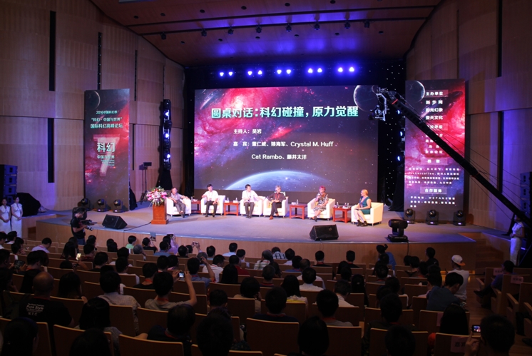在這次高峰論壇的第一單元:“世界科幻之巔”中,華語科幻星云獎創(chuàng)始人作為中國代表與美國科幻奇幻作家協(xié)會主席凱特?蘭博分別作了主題發(fā)言。中國、美國、日本的星云獎主席會長與世界科幻大會雨果獎聯(lián)合主席開展了圓桌對話。