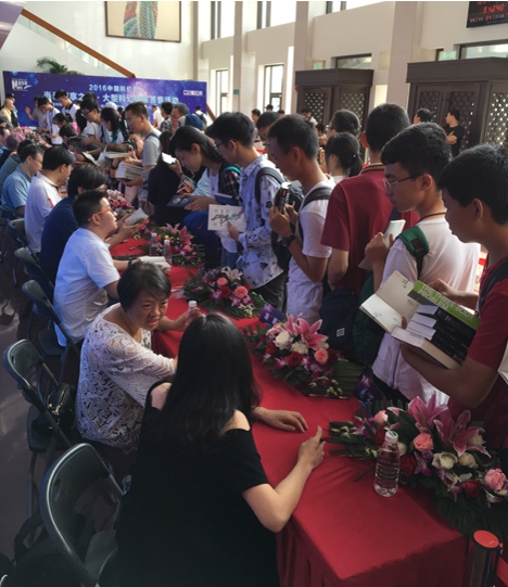 9月11日上午,在中國國家圖書館藝術中心舉行的中外科幻作家集體與科幻迷見面及簽名售書活動,是我們精心策劃組織的一次向世界“亮肌肉”的活動,讓中國和世界知道,中國不止有一個劉慈欣,我們有30后,40后,50后,60后,70后,80后,90后,有持續(xù)不斷的科幻作家隊伍,而且,越到后面,人越多,水平越高。這次來的40位中外科幻作家、評論家、活動家中,有30后中國科幻代表作家之一的劉興詩,40后有不足掛齒的本人,50后有吳巖。然后,是從60后到90后的三代科幻作家,首先是以中國科幻當代“四大天王”劉慈欣、韓松(因公務無法脫身未到場)、王晉康、何夕為代表的新生代科幻作家(潘海天、凌晨等均是這一代人的杰出代表),以“四小天王”陳楸帆、江波、寶樹、張冉及“四小天后”夏笳、郝景芳(未到場簽售活動,但出席了頒獎典禮)、程婧波、遲卉(未到場)為代表的更新代科幻作家(飛氘、梁清散等均為這一代作家的杰出代表),更有一批雖除阿缺外,未走上簽名臺,但出席了簽售活動及頒獎典禮,已鋒芒畢露的十大新銳科幻作家:阿缺、念語、犬儒小姐(未公開露面,但可能隱藏在我們之中)、顧適、王侃瑜、胡紹晏、灰狐、康乃馨、滕野、謝云寧等;還有少兒科幻以楊鵬為首的七小龍:楊鵬(未到場)、超俠、陸楊、周敬之、伍劍(未到場)、馬傳思、彭緒洛;另有科幻評論以吳巖為首的八杰:吳巖、任冬梅、李廣益、呂哲、梁清散、飛氘、姜振宇、肖漢。這些看起來高大上的“頭銜”,起先只是圈內(nèi)互相“揶揄”的昵稱,卻逐步流傳到幻迷、讀者、出版機構之中去,成為了廣泛地受認可的稱謂。