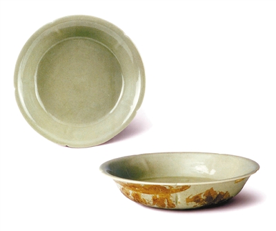 “秘色瓷”一詞最早出現(xiàn)在晚唐詩歌中。唐陸龜蒙對其有“九秋風(fēng)露越窯開,奪得千峰翠色來”之詠。前蜀開國皇帝王建在給后梁開國皇帝朱溫的致謝信中稱贊對方信物中的越窯秘色瓷器“秘色抱青瓷之響”……這些詩情畫意的描述勾起后人對秘色越器的種種遐想和神往。宋代關(guān)于秘色瓷為“供奉之物,不得臣庶用之,故云秘色”的說法更為其平添了幾分神秘色彩。北宋以后,“秘色瓷”消失得無影無蹤,在此后很長一段時間里人們對它的理解也莫衷一是。明清文獻如《格古要論》《長物志》和《飲流齋說瓷》等,對越窯的描述僅僅是轉(zhuǎn)述傳聞而已。直到上世紀八十年代,隨著陜西法門寺真身寶塔西半部轟然倒塌,十三件“秘色瓷”得以告別漫長的幽居歲月,重見天日,方解開了“秘色瓷”的千古之謎?,F(xiàn)今在中國國家博物館展出的一件法門寺地宮出土的“唐代越窯五瓣葵口秘色瓷盤”(見圖),便一展“秘色瓷”的風(fēng)采——造型圓潤飽滿,像一朵盛開的蓮花;釉色碧綠澄澈,如一泓盈盈秋水。