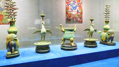 圖為首都博物館“走進(jìn)養(yǎng)心殿”展中展出的嵌琺瑯饕餮紋五供。 邱爽攝/光明圖片