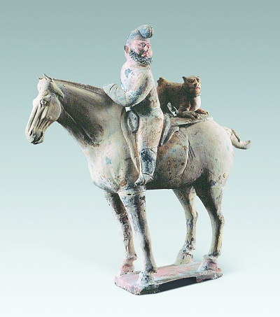 ●唐·彩繪陶騎馬帶豹狩獵胡俑