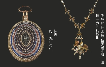 其他類型的珠寶飾品也同樣體現了設計師們的精美創意,以文藝復興時期及新藝術時期的飾品等最為突出。飛翔的丘比特吊墜項鏈、獅子形吊墜、舞女吊墜、橡果形胸針、蜜蜂形胸針、蝴蝶形胸針、酒神女祭司頭像胸針等,多選用造型富于變化的巴洛克式珍珠進行大膽構圖,將自然寓于藝術作品之中,用不同形狀的選材刻畫出巧奪天工的動物、植物、人物形象,使珍珠的表現力達到前所未有的高度。最引人注目的還有薩爾瓦多·達利設計的養殖珍珠與紅寶石唇形胸針,彰顯了藝術大師無可匹敵的設計視角和獨特的裝飾手法。