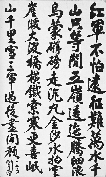 “紅軍不怕遠(yuǎn)征難,萬(wàn)水千山只等閑。五嶺逶迤騰細(xì)浪,烏蒙磅礴走泥丸。金沙水拍云崖暖,大渡橋橫鐵索寒。更喜岷山千里雪,三軍過(guò)后盡開顏。”