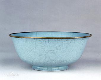 整個碗高7.1厘米,碗口直徑16.9厘米,圈足直徑7.5厘米,重350克。撇口,外鑲銅邊。深弧腹,圈足微外撇。胎體輕薄。通體滿釉,有細小開片。外底有5個細小芝麻狀支釘痕,內底刻有楷書乾隆御題詩:“均窯都出脩內司,至今盤多碗艱致。內府藏盤數近百,碗則晨星見一二。何物不可窮其理,碗大難藏盤小易,于斯亦當知懼哉,愈大愈難守其器。”后署“乾隆丙午御題”,并鈐“比德”“朗潤”二印。目前所見傳世宋代汝窯碗僅有兩件,除這件外,北京故宮博物院亦收藏一件。