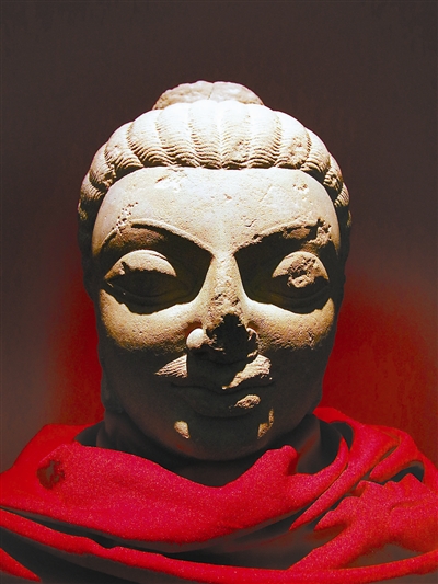 展覽中的這尊阿育王像頭部有高大的肉髻,發髻作起伏的圓丘狀和翻轉的云紋狀,高鼻深目,頭部最顯著的特征是自鼻孔下向兩側生長的小胡子。在印度造像展廳中有一尊來自于北方邦馬圖拉的5世紀佛頭(圖4),也表現有相同的小胡子,這是印度人典型特征之一,據此可知兩者之間應存在某種內在關聯。這尊阿育王像著通肩式袈裟,袈裟衣紋表現為凸起的尖棱線狀,與同地區出土的著褒衣博帶式袈裟佛像存在明顯差異。袈裟胸部衣紋和腹部以下衣紋各自成組,均為同心的U字形自小而大的擴散。這種衣紋線的空間構成關系,與前述的馬圖拉佛立像有一定的相似之處,只是后者胸腹部及以下衣紋并未分為兩組表現。