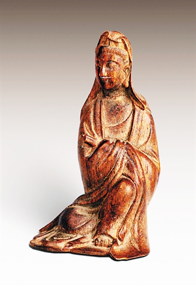 南北朝前后觀音菩薩的形象仍帶有印度觀音的特點,是男性的形象,有些早期觀音塑像可以明顯看到嘴上部的小胡子。從這件現代沉香木雕觀音像來看,是一為溫婉的女性形象,應是唐代以后才出現的觀音造型。唐朝女性的地位有大幅度提高,武則天就曾被認為是彌勒佛的化身;同時女性觀音的慈悲形象也易于被民眾接受,這樣女性觀音在唐代開始出現,自宋元以至明清,女性觀音形象就完全定型了。