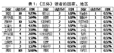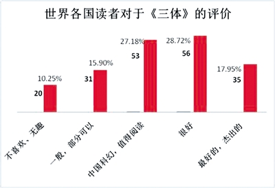 在作品風格和故事情節的分析中,有27.18%的人明確提到了“中國科幻小說”,有28.72%的讀者認為“很好”,17.95%的讀者認為《三體》是“最好的”“杰出的”小說,三項合計為73.85%,恰好印證了2萬多讀者給《三體》打出4分、5分的人數比例。可見“中國科幻”小說、“非西方風格”是《三體》贏得世界上這么多讀者青睞的主要原因。比如有個英國讀者寫到:“作為一個英語國家的讀者,我讀的大部分小說都是西方式的或者英語國家式的。這部小說讓我讀起來感覺很新鮮,人物不再是常見的美國式的、英國式的或者歐洲式的,也不是澳大利亞式的。讀劉慈欣的書,既是閱讀一部包含中國歷史文化的科幻小說,也是閱讀一部不以英語國家和說英語的人物為中心的小說。”有美國讀者寫道:“沒有讓我失望,與我讀過的科幻小說很不一樣,期待閱讀下一部。”“我很喜歡這部小說,它充滿了令人驚喜的科學概念,此外小說中的觀點是非西方式的。”