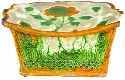 河北省豐寧滿族自治縣是多民族地區,曾先后有肅慎、山戎、匈奴、庫莫奚、契丹、女真、蒙古、滿洲等民族聚居,他們在這里創造了燦爛的民族文化,同時也給后世子孫留下了大量的珍貴文物。豐寧博物館收藏著一件遼代的“三彩瓷枕”(左圖)。這件“鎮館之寶”學名是“三彩云頭形雙碟牡丹紋貼花獅面五角長方形枕”,是遼代的生活用品,目前在全國是唯一一件。右圖為“和尚坐罐”,又叫“蟹青釉開光龍鳳仙人壽字松鶴紋帶蓋葫蘆頂大甕”,為元代和尚的喪葬用品,全國也只發現兩件。