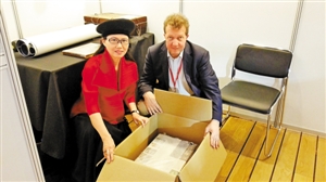 本屆古書展顧問鐘芳玲與麥格斯兄弟古書店負責人在打包《賽勝獵報》。