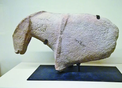 在“人形石碑”單元,我們可以看到有著一百多萬年歷史的石制生產工具,包括石斧、刮削器、箭鏃等,向人們訴說百萬年前阿拉伯人祖先的艱辛與智慧。展柜里有一件石馬,只殘存著頭部和軀干。然而,可別小看這個貌不驚人的石馬,它可是距今一萬年前的石雕。它從鼻子至肩部的脊狀有著明顯的刻畫,沙特的專家說,這些刻畫很可能代表著早期的韁繩。也就是說,在那個時期,沙特地區的人們可能已經擁有了馴化馬的技術。而在此之前,人們多認為馬的馴養最早發生在公元前3500年的中亞地區。