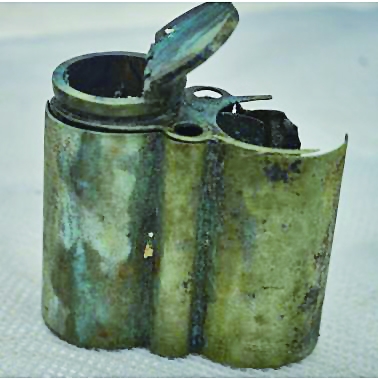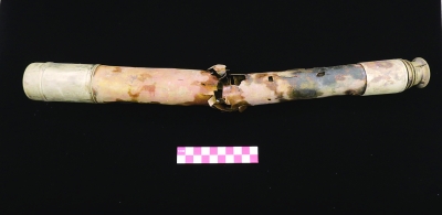 圖為陳金揆單筒望遠鏡,保存基本完好,僅中部被擠壓破碎,包括三個目鏡片、一個物鏡片。該望遠鏡全長50厘米,物鏡7厘米。物鏡上刻有英文花體字,初步辯識為“Chin Kin Kuai”,為致遠艦大副陳金揆的英文名字。