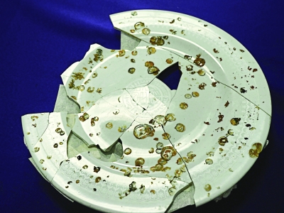 “致遠”篆書白瓷餐盤。盤心有篆書“致遠”二字,外圈為字母,上半圈為“CHIH YüAN”(致遠威妥瑪拼音),下半圈為英文“THE IMPERIAL CHINESE NAVY”,組合成一個圓形徽標。盤口沿處一圈錦紋,紋飾原有描金,因海水浸蝕僅留下紋飾印痕??趶?0.5厘米、底徑11.5厘米、高1.5厘米。
