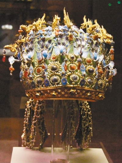 在中國,珍珠被用作裝飾的歷史,可遠溯至周朝初始,據《格致鏡原·妝臺記》記載,周文王曾用珍珠裝飾發髻。秦漢之后,珍珠飾品迅速普及,帝王將相、達官貴人無不以珍珠裝飾為榮。最好的例證是北京定陵出土的明萬歷時的龍冠和鳳冠,其上都裝飾了規模不等的天然珍珠,向世人展示著古代宮廷工藝的豪奢,如現為中國國家博物館收藏的孝端皇后的“九龍九鳳”冠(見圖一),龍鳳口中都銜有包含珍珠在內的珠寶,冠面更鑲嵌珍珠5000余顆。至清朝,皇家對天然珍珠的喜愛顯然到了極致。傳世的一件清代道光年間的龍袍,前后兩面的9條龍圖案均由數以萬計的天然淡水小珍珠繡制而成,制作可稱巧奪天工。