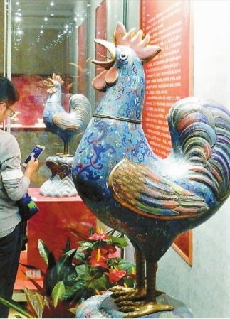“錦繡雞——南京博物院藏雞文物展”近日在南京博物院特展館舉行,近兩百件雞文物包括玉器、瓷器、織繡、繪畫、紫砂器和木刻年畫等等,從不同側(cè)面詮釋了雞的形象中包含的中國傳統(tǒng)文化。圖為展覽展出的民國時(shí)期“雄雞報(bào)曉,四海升平”景泰藍(lán)雄雞銅擺件。 王路憲攝/光明圖片