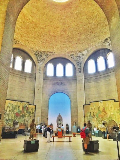 中國藝術是美國賓夕法尼亞大學考古和人類學博物館的收藏特色之一,其中國展廳設在博物館建筑最核心區域———一座圓形的大廳內,擁有數量質量均可觀的中國古代青銅器、陵墓石刻、佛教雕塑和寺觀壁畫等,曾經引領過北美地區中國藝術的收藏風潮。“中國圓廳”甚至成了北美學界的專有名詞,專指賓大博物館主穹頂下收藏著的藝術奇珍。圖從左至右分別為賓大博物館館藏唐三彩馬以及“中國圓廳”內景。