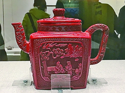 紫砂胎剔紅山水人物圖方執(zhí)壺 本報(bào)記者 蘇雁攝/光明圖片