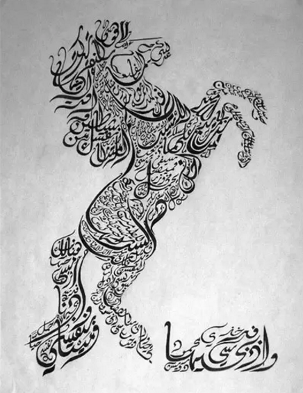 這張阿拉伯文書法畫是馬哈茂德·達爾維什一首名為“Take My Horse and Slaughter It”詩歌的詩詞。書法從馬首到馬尾一次完成,右下角是作者的名字。