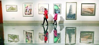 1月24日,山西省永濟市博物館歷史文化展展廳,攝影愛好者興致勃勃地欣賞當地舉辦的“文博杯”文物攝影大賽作品展。