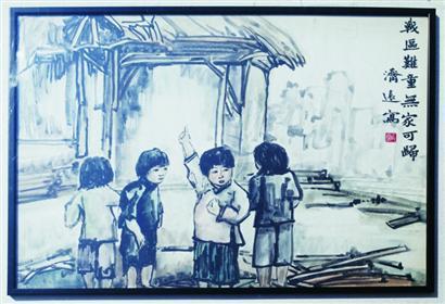 王濟遠繪《戰區難童無家可歸》水墨畫