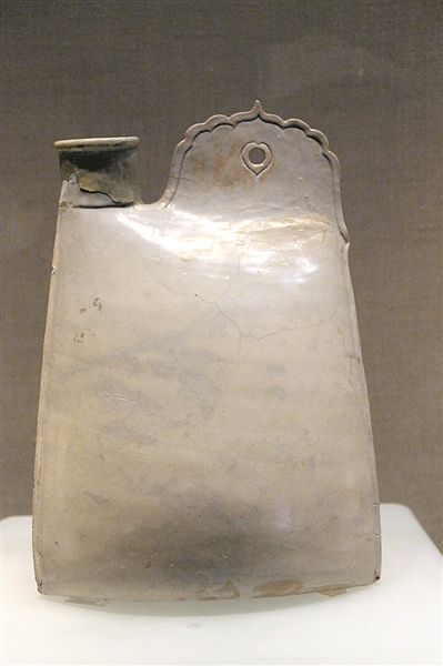 頂冠故名“雞冠壺”。雞冠壺因又形似馬鐙,也被稱為“馬鐙壺”。黃釉、綠釉、白釉皆有,有的還有皮帶裝飾。這些器物便于攜帶,適合騎馬射獵的生活需要,保留有游獵生活的形跡。