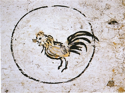 墓室西側的雞,與十二生肖中的“酉”位相對。身體輪廓的顏色為黑彩,內填黃彩,高約25厘米。寥寥數筆,但很傳神。它雙腳直立,頭前傾,尾翼展開。雄赳赳,氣昂昂,斗志昂揚,似乎拉開架勢準備大干一場。實際上,古人很早就注意到公雞的好斗習性。《戰國策》中記載,齊國都城臨淄其民無不吹竽、鼓瑟、擊筑、彈琴、斗雞、走犬。斗雞,至少在兩千多年前就已經成為人們的一種娛樂方式。