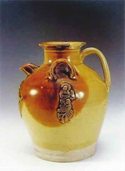 青龍鎮遺址考古展上展出的唐長沙窖貼花褐彩壺。