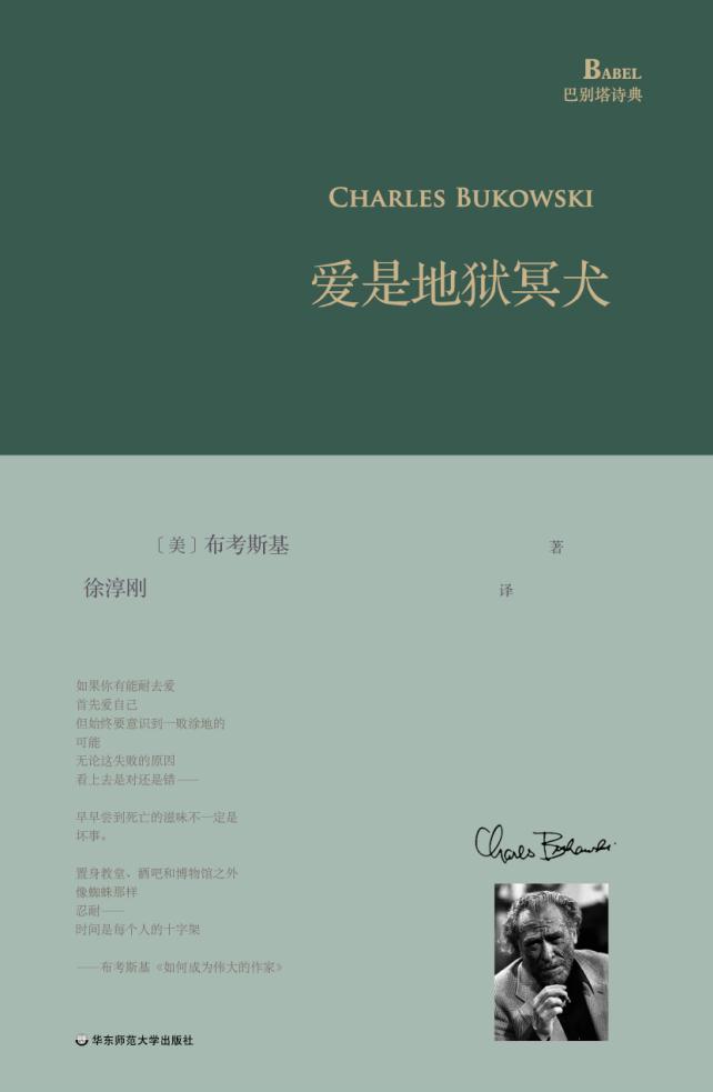 在美國,布考斯基早已是非學院派的偉大經典了。他的作品更以十多種語言在世界各地出版,尤其在歐洲廣為流傳,累計銷售數百萬冊。就中國而言,臺灣已出了他的幾部作品集,大陸也正式出版了他的兩部小說集,而地下的翻譯、出版也有很多。很幸運,這部《愛是地獄冥犬》(Love Is A Dog From Hell),是第一本在國內公開出版發行的布考斯基詩集,可以讓更多喜歡布考斯基的人讀到。這部詩集首版于1977年,內容都是布考斯基的私生活,抒寫了布考斯基坦蕩不羈的愛,他的女人,他的絕望,他的傷痛,他的勇氣……時隔近40年這部詩集終于有了中文版,這首先要感謝華東師范大學出版社,感謝何家煒兄為這本詩集的編輯出版所做的大量工作。感謝詩人、出版人方閑海,他于2013年獨立出版的拙譯《生來如此——布考斯基詩集》,讓我為這本詩集的翻譯出版積累了很多經驗。感謝大家,對我翻譯工作的信任與期待。讓我們通過詩歌,繼續思考展現在我們面前的生活。