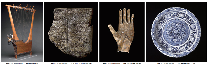 圖1:第013號展品 王后豎琴 圖2:第015號展品 “大洪水”記錄板 圖2:第037號展品 阿拉伯青銅手 圖2:第067號展品 中國青花大盤