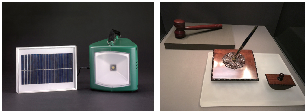 左圖:第100號展品 太陽能燈具與充電器 右圖:第101號展品 宣布中國重返世貿組織的木槌和中國重返世貿組織的簽字筆